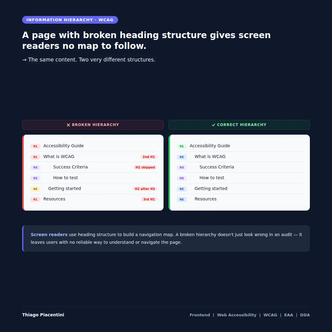 The failure is silent and invisible to sighted users. But for anyone navigating with a screen reader, a broken heading hierarchy is the difference between a page that can be navigated efficiently and one that must be read linearly from top to bottom — removing the primary advantage that assistive technologies provide.